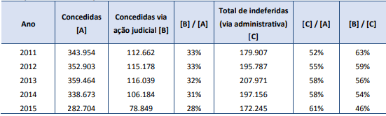 Essa subjetividade no processo de reconhecimento do direito gera insegurança na concessão do benefício previdenciário ao segurado especial, tendo como conseqüência o elevado número de aposentadorias concedidas via judicial. De 2011 a 2015, conforme se observa na figura 2, cerca de 30% das aposentadorias rurais concedidas foram indeferidas na via administrativa, mas asseguradas pela Justiça.