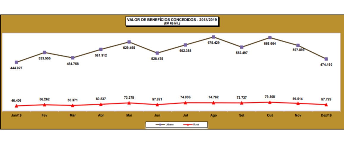 Valor de benefícios concedidos 2018/2019 (em R$ MIL) (Brasil: 2019)