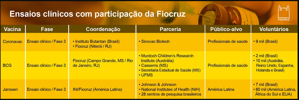 Considerando que a ausência de informação é uma das críticas que os autores deste artigo fazem, consideremos os seguintes pontos: (i) a Fiocruz, em sua página, noticiou estar participando ou coordenando três ensaios clínicos no Brasil para vacina contra a covid-19. Na publicação ela reforça que todos os ensaios encontram-se em fase 3 reforçando seu caráter experimental; (ii) as etapas de desenvolvimento levam em torno de 10 a 15 anos.[16]
