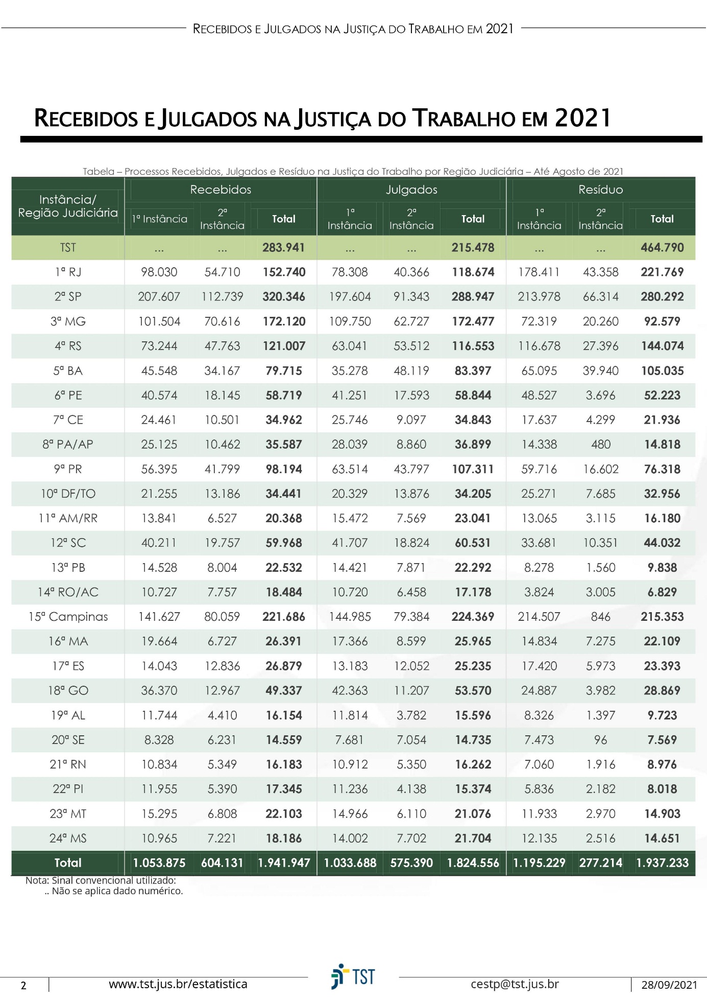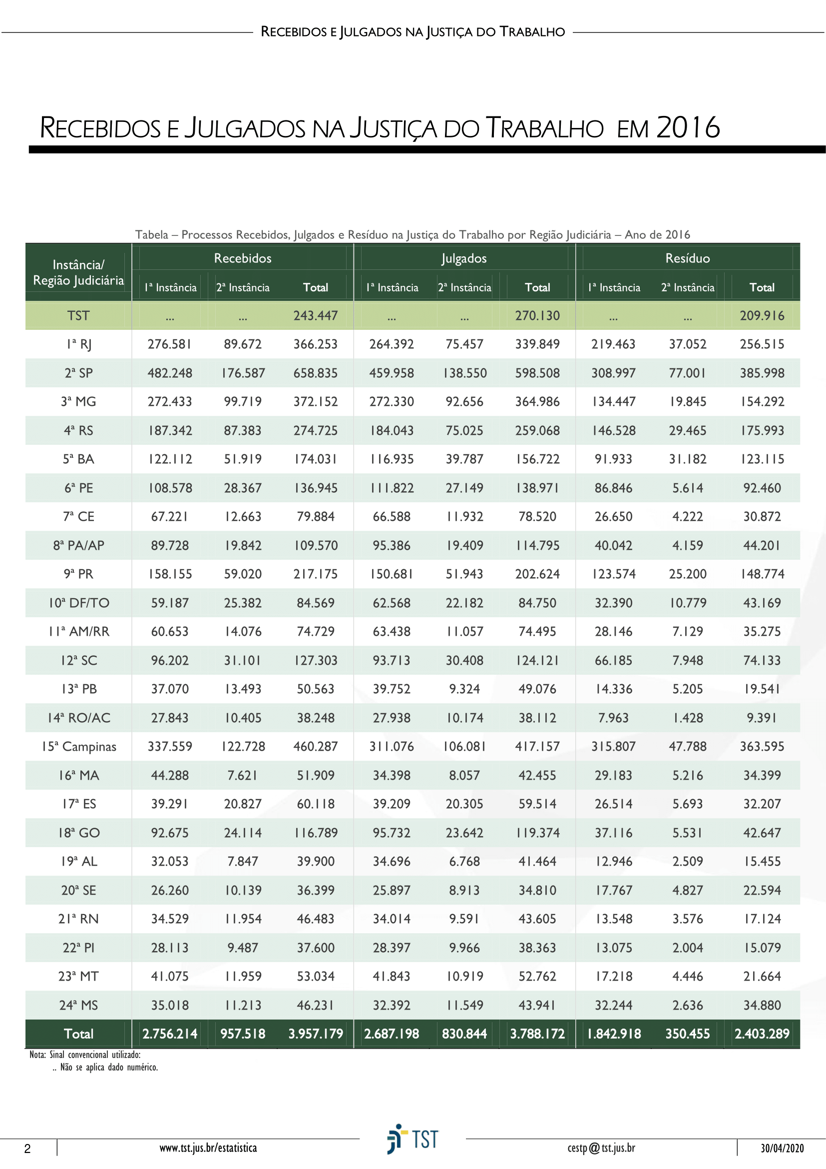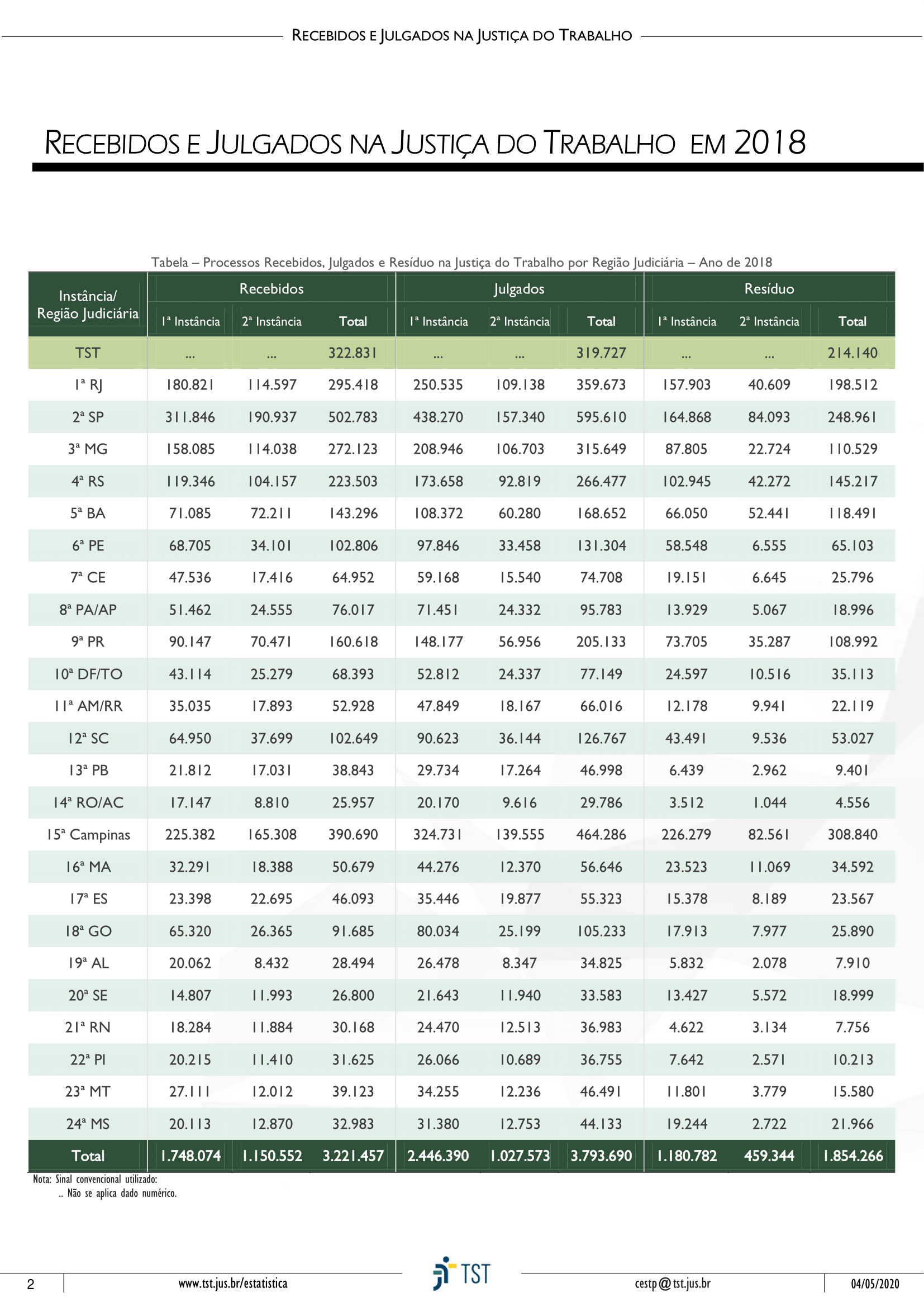Trazendo esses fatos em números é possível observar que após a reforma houve consequências relacionadas as entradas de novos processo, nesse quadro temos números das entradas de novos processos, os processos eu foram julgado e os resíduos, também há números de todos tribunais do trabalho de vários estados contanto com o próprio TST, sendo divido os processos em 1° instancia, 2° instância e o total.