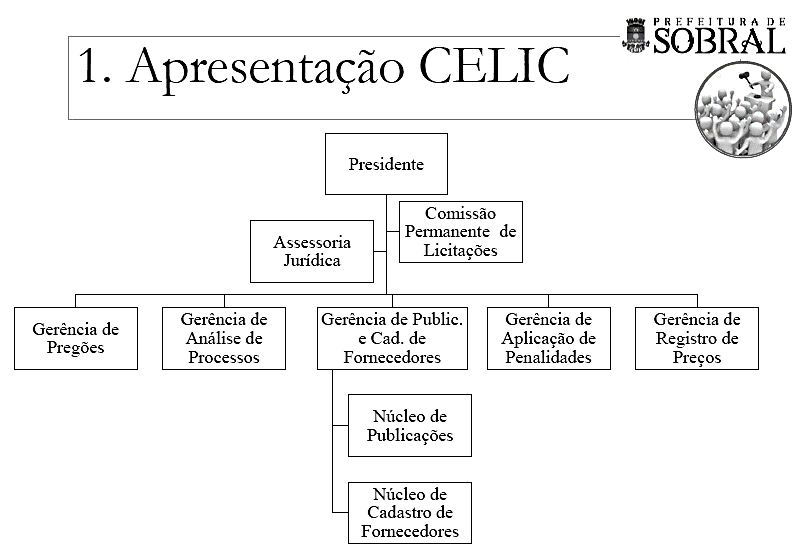 Em sua composição, a CELIC organiza-se em quatro níveis hierárquicos: no primeiro nível encontra-se o presidente, logo abaixo deste estão a assessoria jurídica e a Comissão Permanente de Licitação; no terceiro nível hierárquico tem-se a gerência de pregões, gerência de análise de processos, a gerência de publicação e cadastro de fornecedores, gerência de aplicação de penalidades e a gerência de registro de preços. No quarto nível hierárquico, sendo este um desmembramento da gerência de publicações e cadastro de fornecedores, encontra-se o núcleo de publicações e o núcleo de cadastro de fornecedores. Conforme observa-se na Figura 1 apresentada abaixo.
