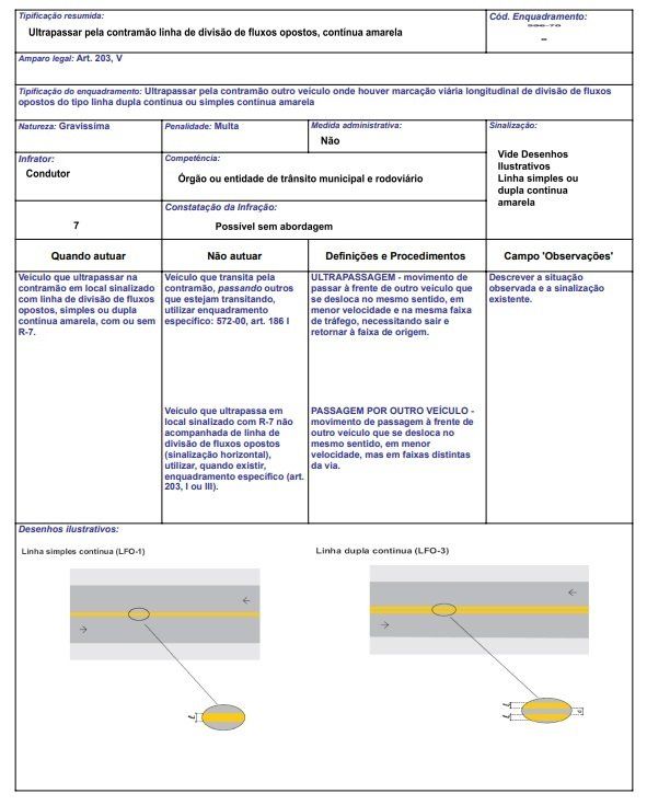 Um exemplo de ficha individual de enquadramento é a do artigo 203, V, do CTB, por ultrapassar pela contramão outro veículo onde houver marcação viária longitudinal de divisão de fluxos opostos do tipo linha dupla contínua ou simples contínua amarela. Esta é uma infração bem cara, com multa no valor de R$ 1.467,35, além de contar 07 pontos ao prontuário do infrator.