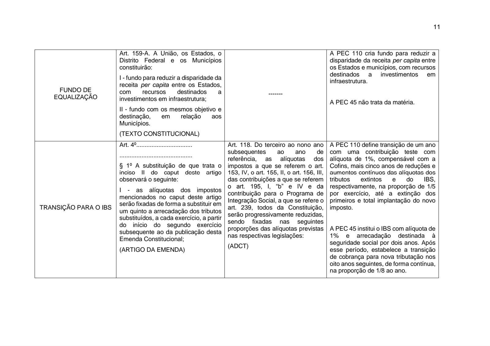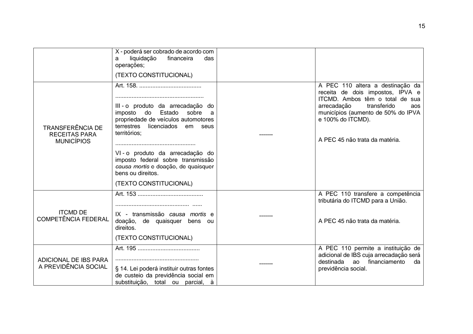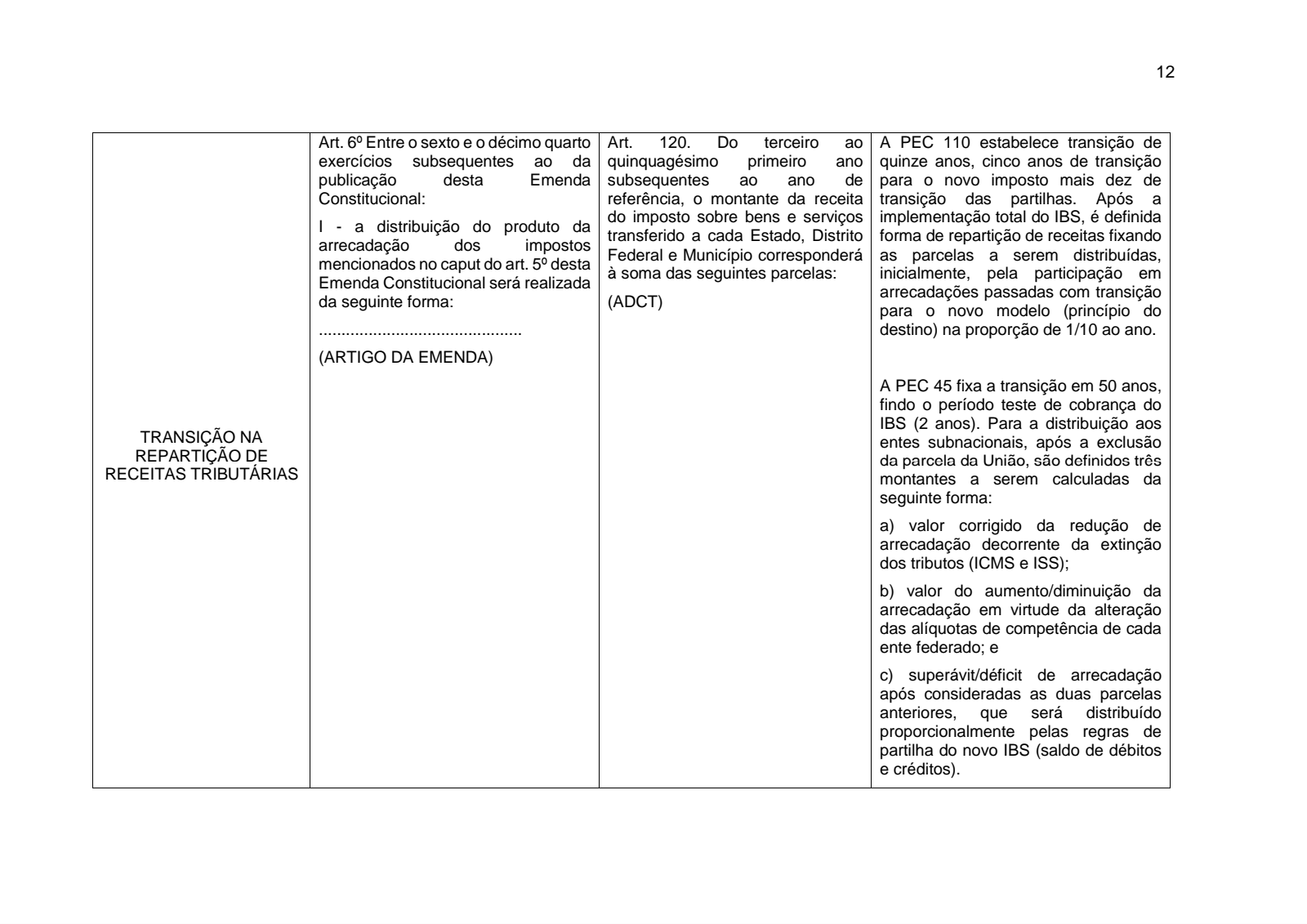PEC 110: no total, a transição será de quinze anos; a partir da criação dos novos impostos, cada ente federativo (União, cada Estado, Distrito Federal e cada Município) receberá parcela das receitas dos impostos novos de acordo com a participação que cada um teve na arrecadação dos tributos que estão sendo substituídos; após a implementação definitiva do novo sistema de cobrança, prevista para durar 5 anos, a regra retro descrita é progressivamente substituída pelo princípio do destino, à razão de um décimo ao ano;