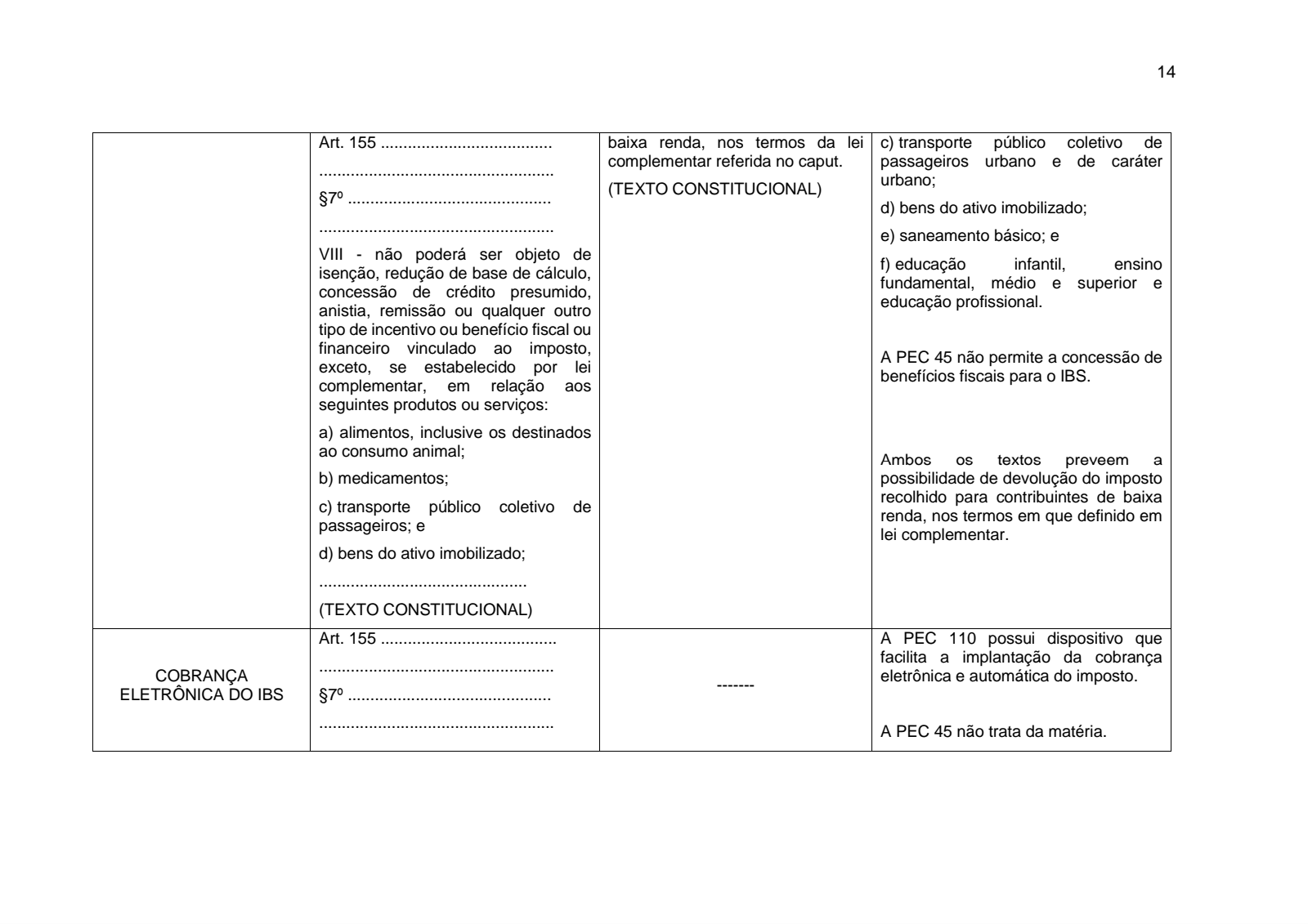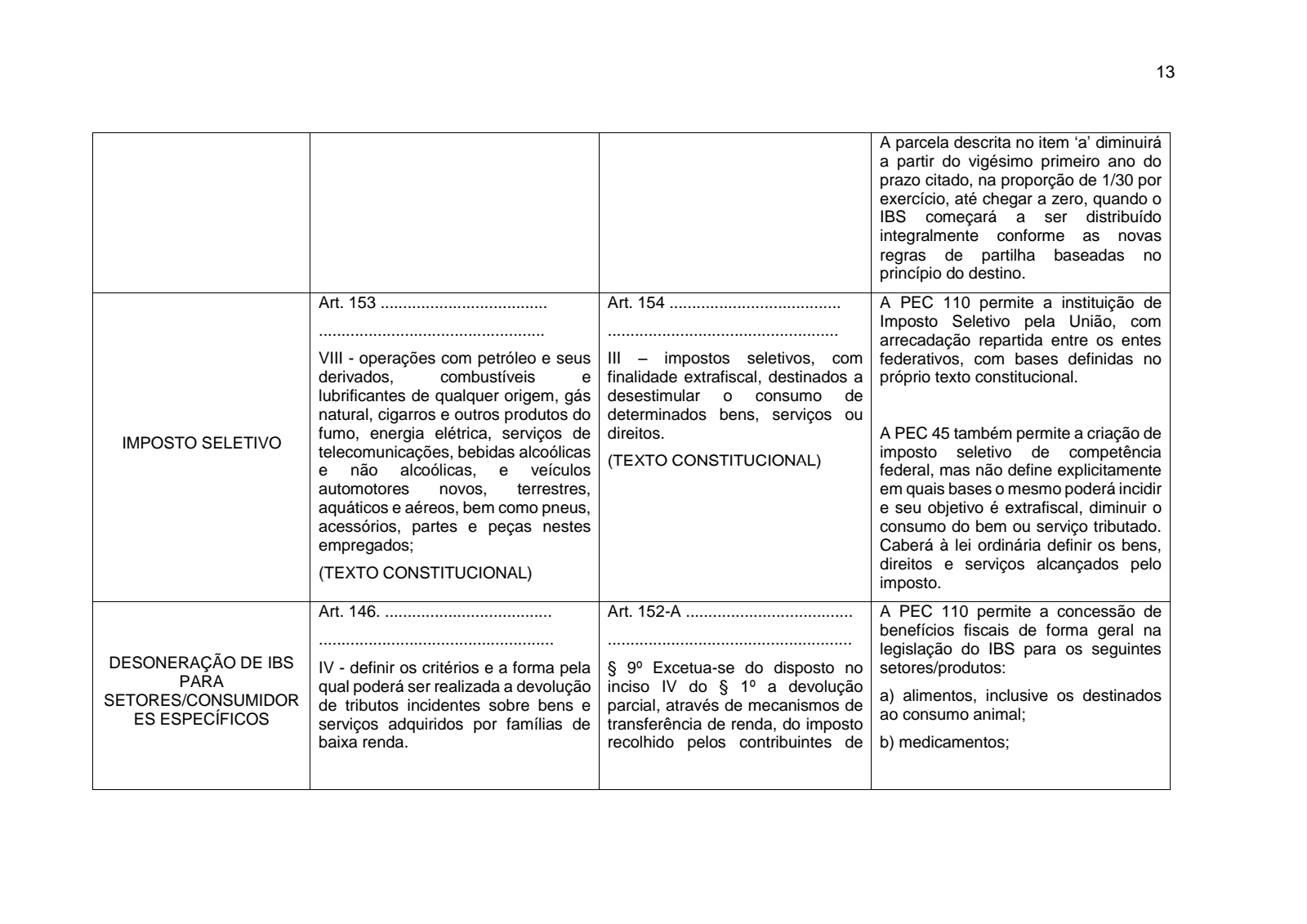 PEC 110: autoriza a concessão de benefícios fiscais (por lei complementar) nas operações com alimentos, inclusive os destinados ao consumo animal; medicamentos; transporte público coletivo de passageiros urbano e de caráter urbano; bens do ativo imobilizado; saneamento básico; e educação infantil, ensino fundamental, médio e superior e educação profissional;