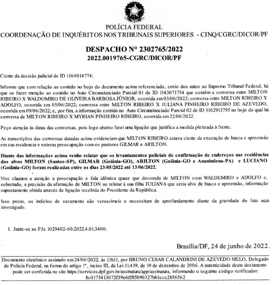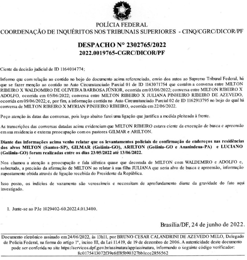 Vale relevar que, por meio do Despacho nº 2302765/2022 da CGRC/DICOR/PF, cujo acesso ao referido documento foi obtido pela imprensa, o delegado de Polícia Federal, Bruno Calandrini, responsável pela investigação, afirmou que no trecho da conversa entre Milton e sua filha deve fazer parte do inquérito. E que chamou atenção a declaração de Milton de que seria alvo de busca e apreensão, e de que a informação teria sido passada ao ex-ministro por Bolsonaro. E, no final do aludido documento, a manifestação seguinte: Isto posto, os indícios de vazamento são verossímeis e necessitam de aprofundamento diante da gravidade do fato aqui investigado, de acordo com aludido documento abaixo: