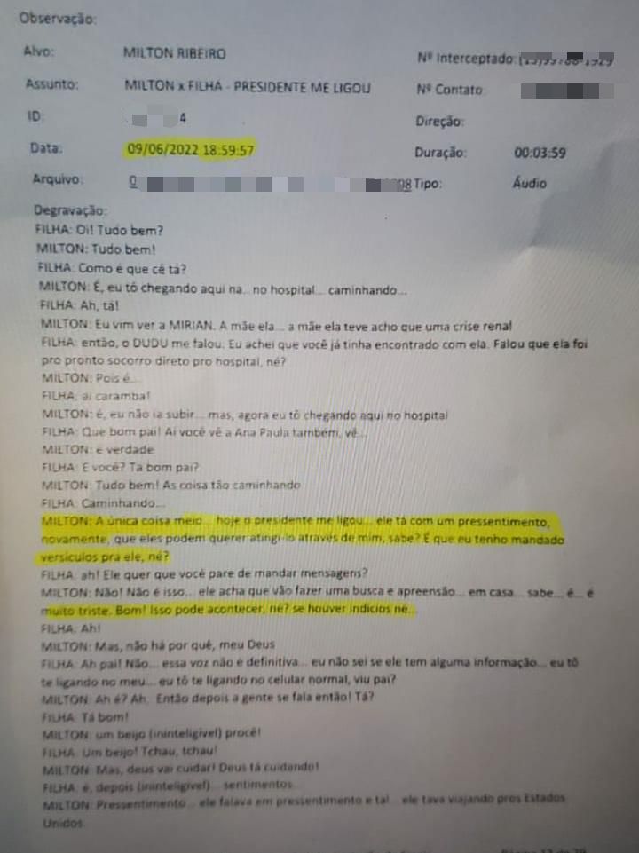 Traduzindo-se, o ex-ministro Milton Ribeiro, afirmou durante uma conversa telefônica com sua filha, que o Presidente Bolsonaro, teve um pressentimento novamente, que eles podem querer atingi-lo através de mim, sabe? E que tenho mandado versículos para ele né? Filha ah! (...) ele acha que vão fazer uma busca e apreensão (...).
