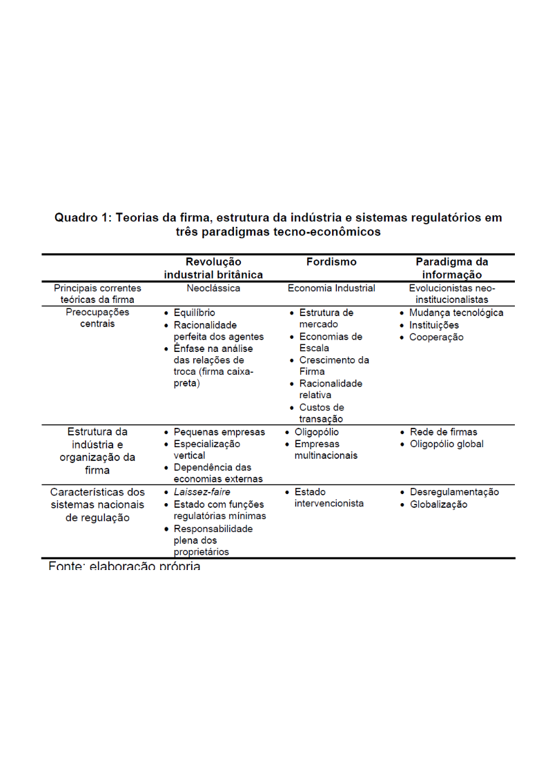 O texto analisa a relação histórica entre firma e mudança tecnológica, segundo três paradigmas: (i) a revolução industrial britânica, que dominou a economia mundial durante todo o século XIX e foi a base de observação para a elaboração da teoria neoclássica; (ii) o paradigma fordista, que efetivamente deu origem à economia industrial; e (iii) o paradigma das tecnologias da informação, cuja construção teórica está baseado, principalmente nas correntes evolucionistas e neo-institucionalistas" (TIGRE, 2005, p. 01).