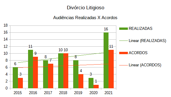 No ano de 2015, das 114 audiências de conciliação realizadas, 6 foram referentes a divórcio litigioso, resultando 50% dessas audiências em acordos.