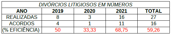 Em 2016, das 143 audiências de conciliação realizadas, 11 foram de divórcio litigioso, resultando em um total de 81,82% em acordos.
