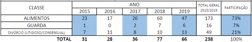Das questões decorrentes do divórcio litigioso, como por exemplo, alimentos, tivemos no ano de 2015, o total de 26 audiências de conciliação realizadas, e em 2016, 19 audiências, em 2017, 27 audiências, em 2018, 58 audiências, e em 2019, o total de 48 audiências de conciliação, conforme se vê na tabela 2: